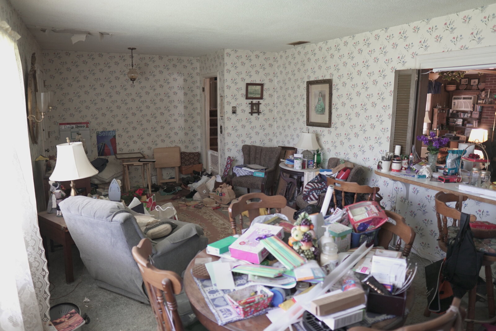 La sala de estar es de 24 ‘x 12′ Manchas en la alfombra, el papel pintado es viejo, el techo de palomitas de maíz tiene algunas lágrimas