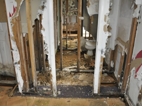 4 (possibly 5) bedrooms. Bedroom #1 is 12′ x 26′ located upstairs. Subfloor, holes in walls, ceiling needs to be replaced and has 1 closet. Bedroom #2 is 12′ x 16′ and located downstairs. Tile floor is coming up and needs to be replaced, along with the walls. Ceiling needs to be painted and it has 1 closet. Bedroom #3 is 13′ x 10′ and located downstairs. Floors and walls need to be replaced, there are spots on the ceiling and it has 1 closet that needs to re rehabbed. Bedroom #4 is 16′ x 13′ and located downstairs. Floor needs to be replaced, walls are not finished, ceiling appears intact and has an unfinished closet.
