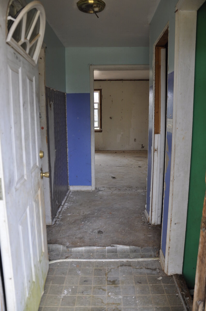 Dining room is 14′ x 18′. Unfinished walls with holes, subfloor that is loose in spots, ceiling that needs to be painted.
